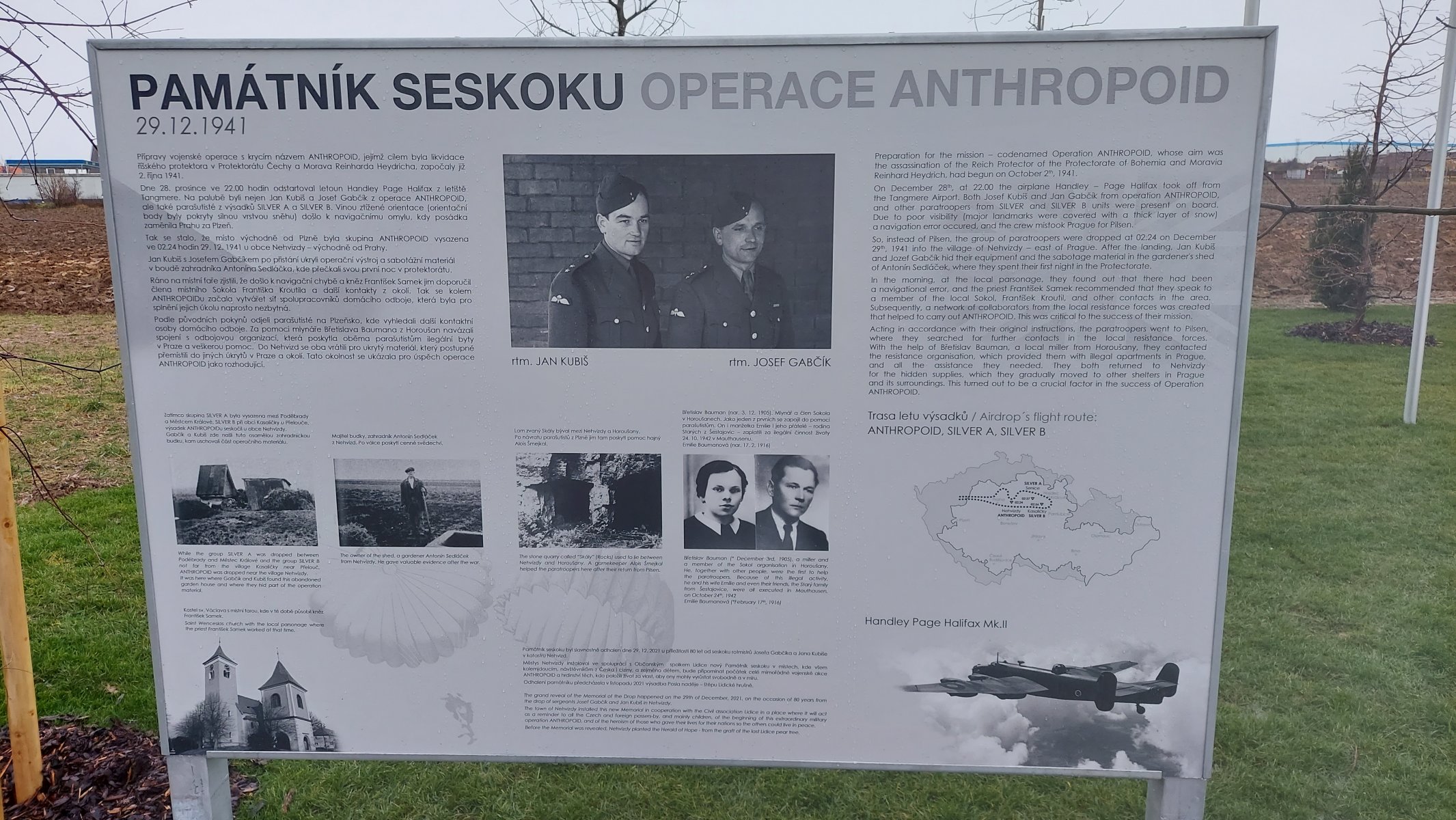 Čelákovice, Záluží, Nehvizdy, pomník v místech seskoku, Vyšehořovice, Mochov